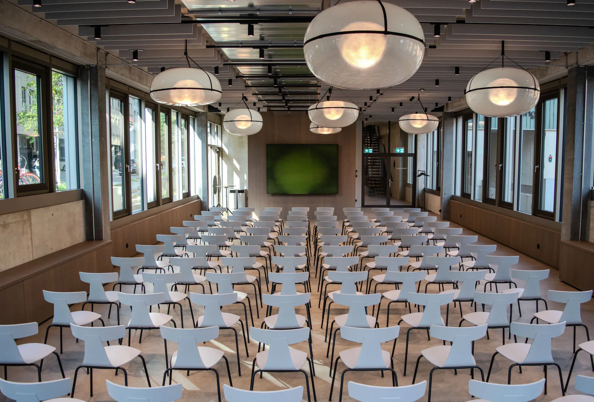 Die Werkstatt bietet einen offenen, vielseitig nutzbaren Raum für Workshops, Seminare oder kollaborative Projekte. Grosszügige Fensterflächen sorgen für viel Tageslicht, während flexible Möbel, moderne Infrastruktur und textile Raumtrenner unterschiedliche Arbeits- und Veranstaltungssituationen ermöglichen.